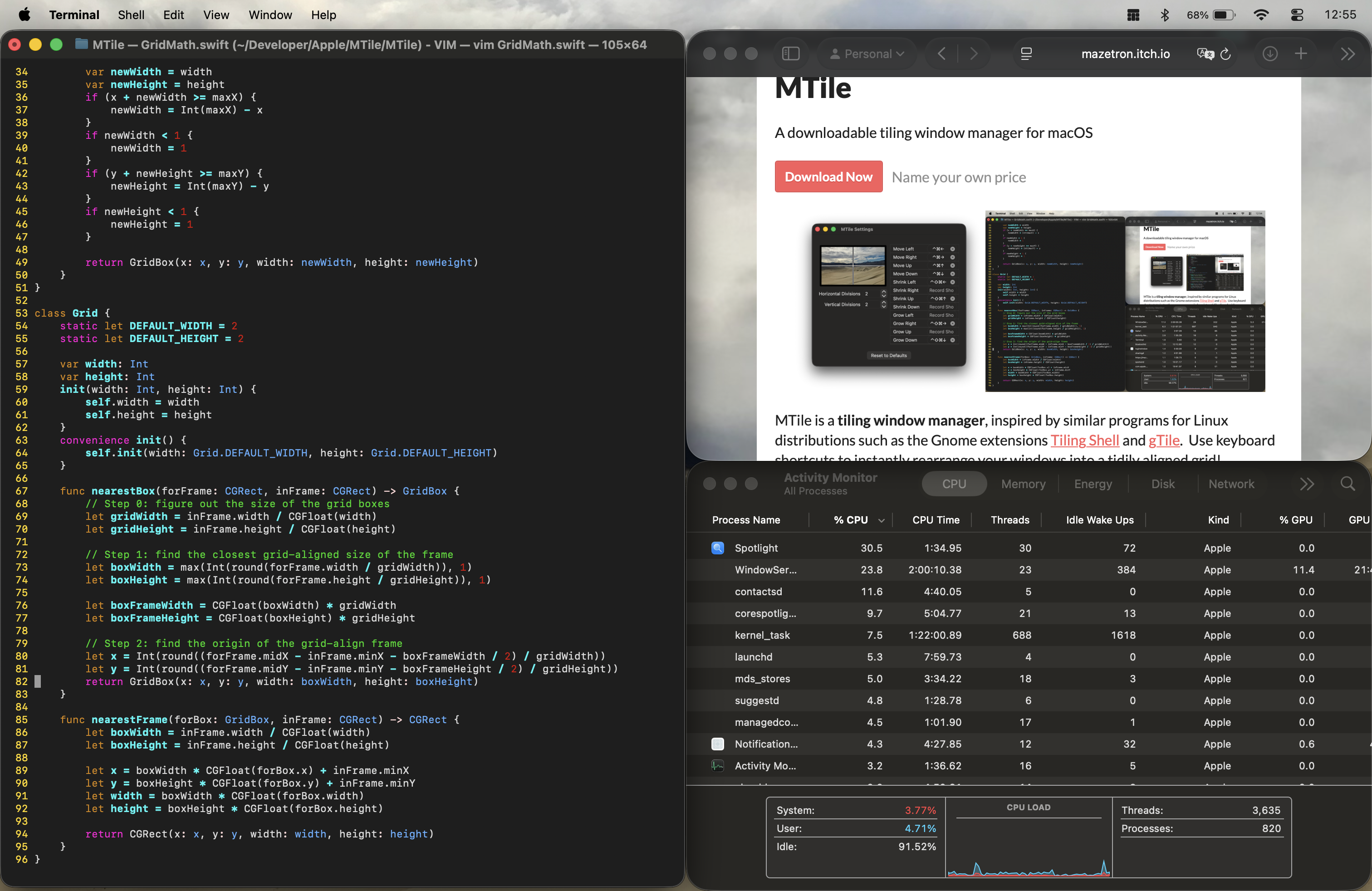 MTile is a tiling window manager for macOS, inspired by similar programs for Linux distributions such as the Gnome extensions Tiling Shell and gTile. Use keyboard shortcuts to instantly rearrange your windows into a tidily aligned grid!